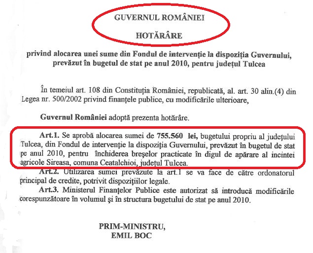 „Se aprobă alocarea sumei de 755.560 lei, bugetul propriu al județului Tulcea, din Fondul de intervenție la dispoziția Guvernului, prevăzut în bugetul de stat pe anul 2010, pentru județul Tulcea, pentru închiderea breșelor practicate în digul de apărare al incintei agricole Sireasa, comuna Ceatalchioi, județul Tulcea”, se arată în hotărârea semnată de Emil Boc. Au contrasemnat documentul ministrul Administrației și Internelor Traian Igaș, ministrul Finanțelor Publice Gheorghe Ialomițeanu și ministrul Mediului Laszlo Borbely.