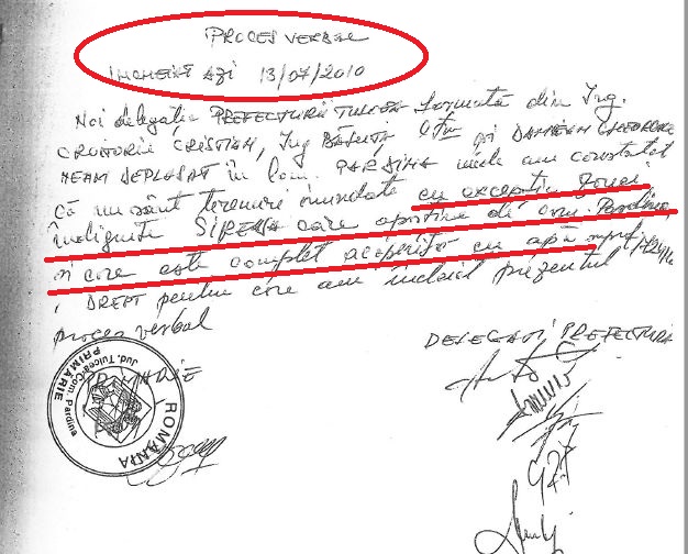 Într-un proces-verbal, datat 13 iulie 2010 și întocmit de delegați ai Prefecturii Tulcea și primarul din Ceatalchioi, Simion Damianov, document obținut de Cetateanul.net, se consemnează că întreaga incintă agricolă Siresa este acoperită de ape.